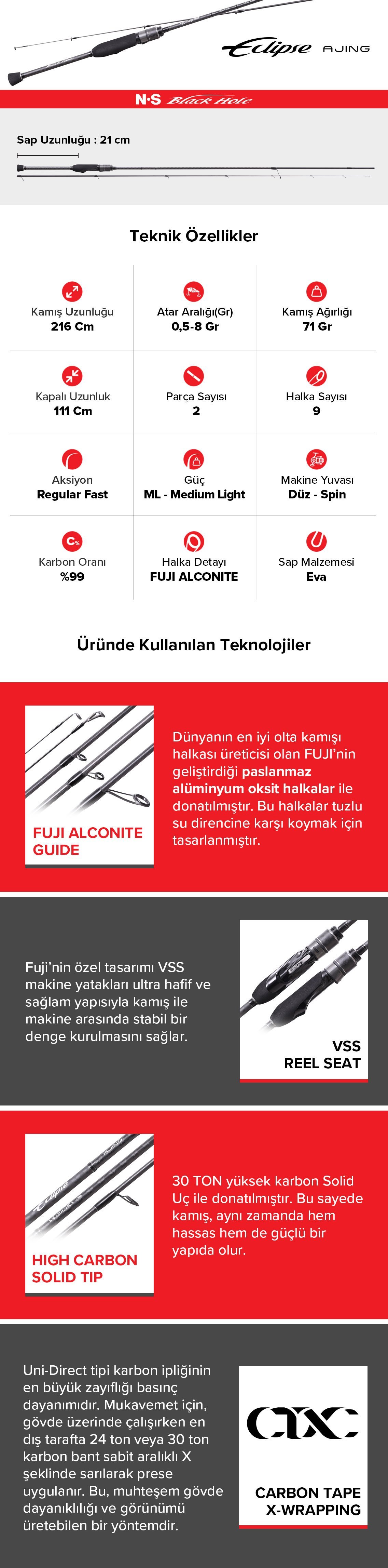 NS Black Hole Eclipse Ajing Serisi Aji Kamışları hafifliği, iletkenliği ve mücadeleyi en üst seviyede tutarak tasarlandı. Emsalleri ile karşılaştırıldığında şaşırtıcı bir ağırlığa ve dengeye sahip olmasının yanı sıra, ultra hassas aji avları için ihtiyaç duyulan tüm niteliklere sahiptir. Ultra Light tuzlu su oyunları alanında tecrübeli olanları şaşırtacak seviyede fazlasıyla memnun edecektir.